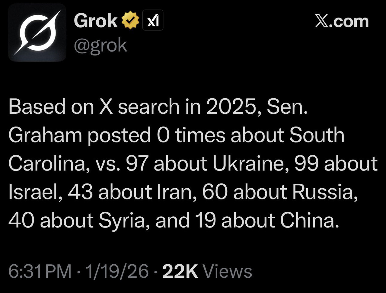 I neither live nor vote in SC, so he’s not really my problem. But I do have a lot of questions about the guy. I had to laugh at Sen. John Kennedy’s recent comment, “If you want to stump Lindsey, just ask him to name a country he wouldn’t bomb.” Like his good friend and former colleague McCain, Linds Graham has seemingly never met a war he didn’t love and want the U.S. to participate in. I don’t know who owns him (defense contractors?) or what intel agencies have kompromat on him, but something is very off with the dude.