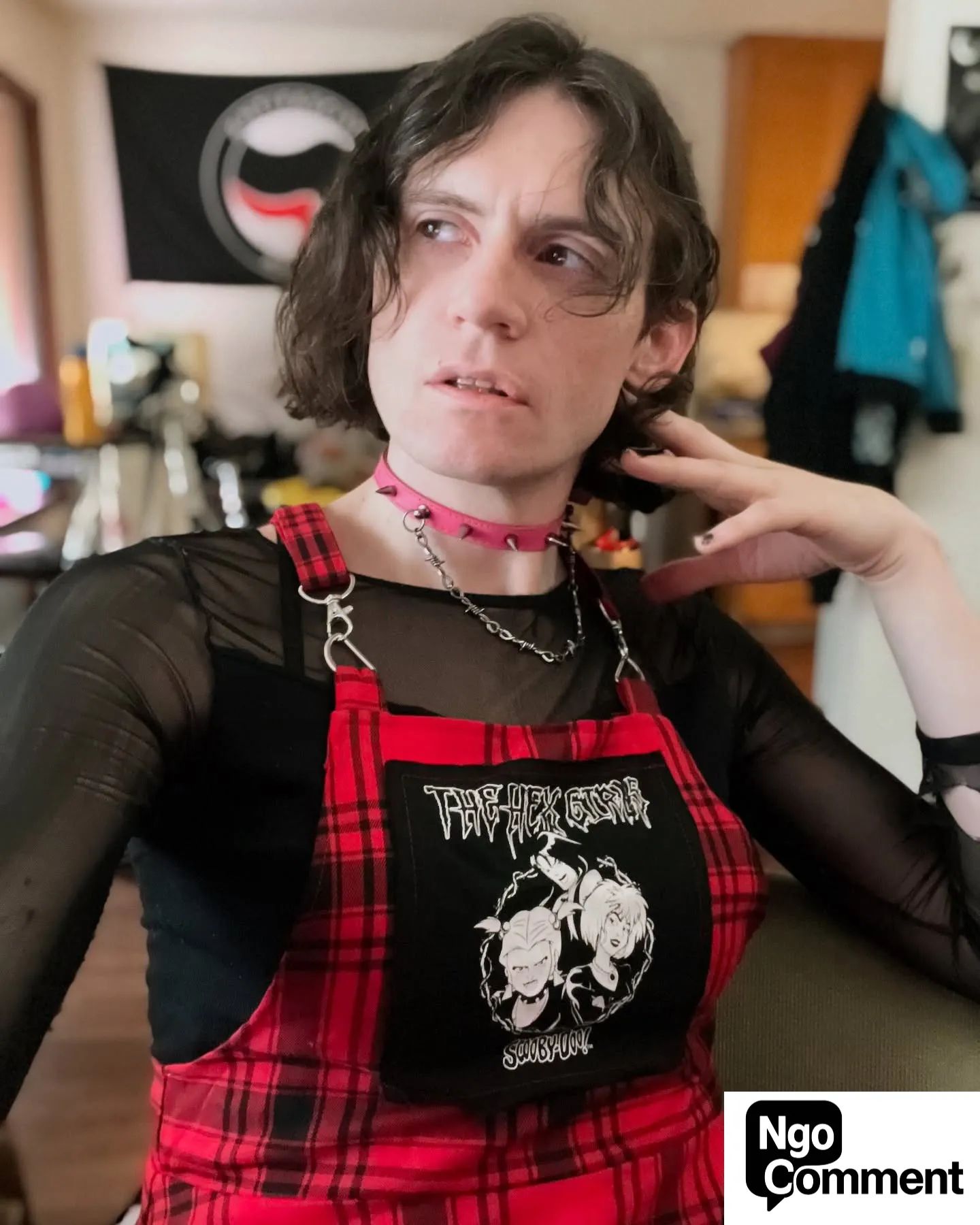 Rem Heathen, real name Michael Richard Fadich poses in front of an Antifa flag in his home