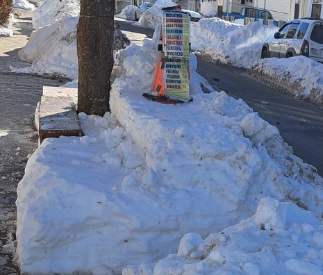 Snow after a few day. Sign lists Major Sins of America. One side in English, another in Spanish. Snow is cut into a shelf for banana boxes containing various items of surplus food that we are blessed to be able to pick up to be given away once a week, and I usually give each new person a gospel tract, by the grace of God + to His glory.
