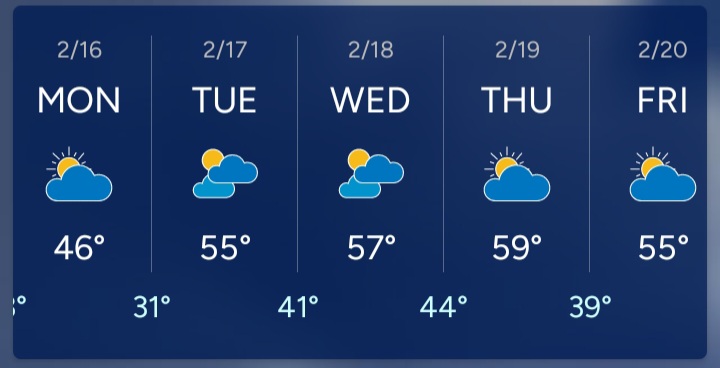 Weather wise, 40’s tomorrow, 54 Saturday, 40’s & rain Sunday, then warming up for next week. Hopefully, the rain will help get rid of the snow.