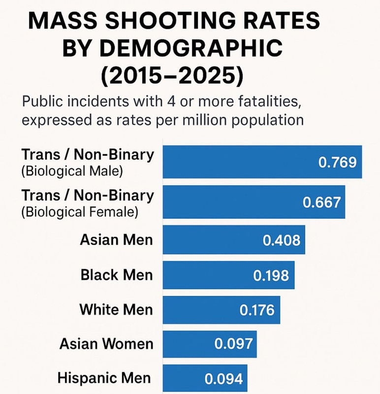 I don’t doubt the chart either. In my experience, people are terrible with percentages. I understand the numerator, but what is the denominator? US population probably. I’d like a calculation based on the designated group. Tranny Mass shooters / Tranny population, etc.