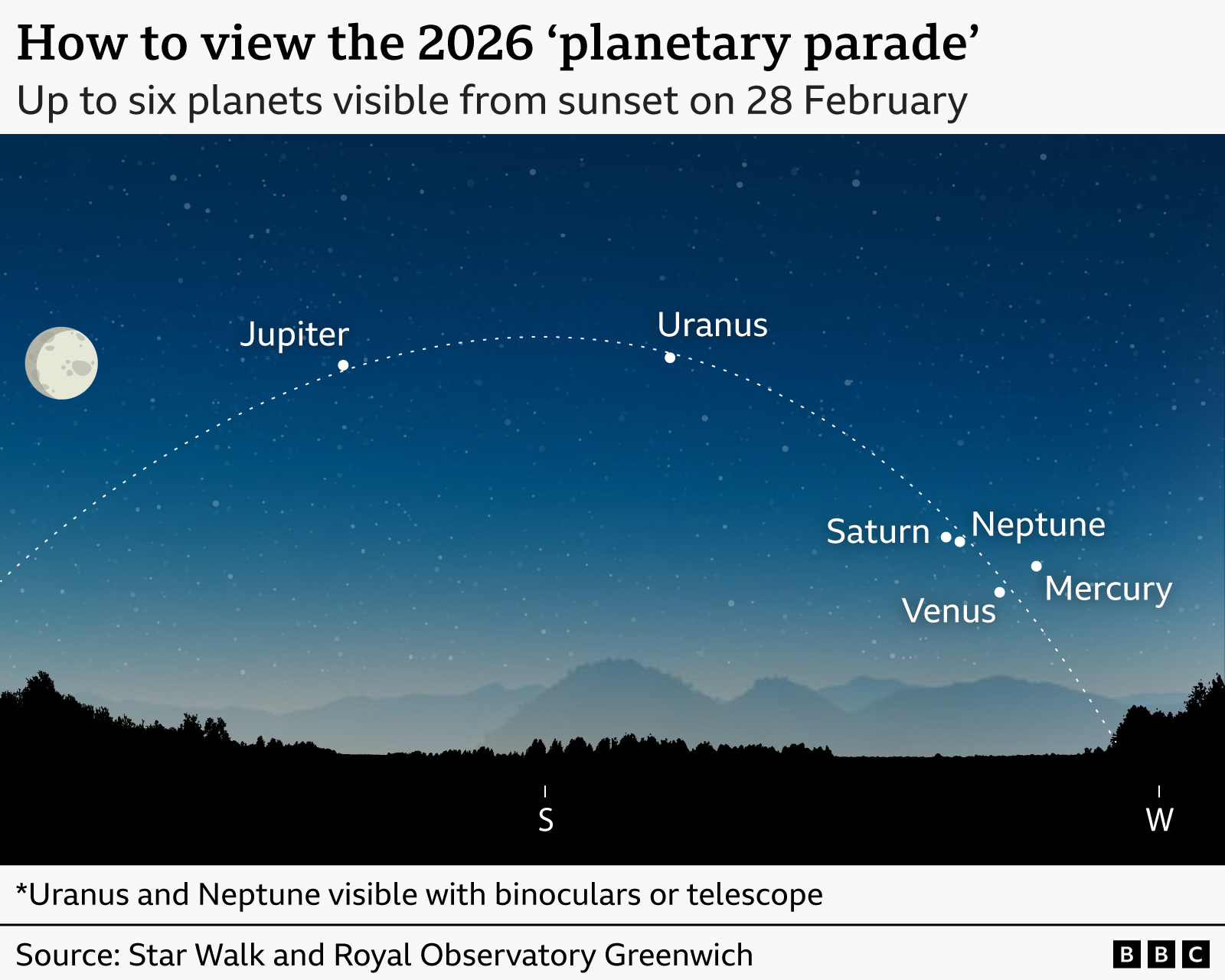 This weekend provides a rare treat for stargazers. Well, planets, to be more specific. Mercury, Venus, Neptune, Saturn, Uranus and Jupiter will will appear to line up on the horizon shortly after sunset on Saturday, Feb. 28. Four of the six planets will be visible to the unaided eye, while the other two will require a telescope. The rare celestial occasion, a planetary alignment or planet parade consists of three to five planets and can occur every few months to every few years. However a six or seven planet parade is more rare. Here’s what to know about Saturday’s “planet parade” and when your best chances of seeing planets in the sky will be. What is a planetary alignment? A planetary alignment is an astronomical event that occurs when several planets are positioned together closely on one side of the Sun at the same time. This can happen a few times a year, according to Star Walk, an astronomy and space guide app. There are different types of planetary alignments which depend on how many planets participate. They range from mini planetary alignment – three planets; small planetary alignment – four planets; large planetary alignment – five or six planets; great (full) planetary alignment – all Solar System planets (and Pluto sometimes). This upcoming alignment is a large planetary alignment.