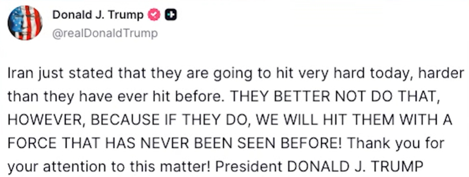Anyway, anyone who has historically physically attacked us ( at Hormuz, USS Cole, and our allies, builds uranium enrichment plants,sends out drones, and fires missiles, sponsors worldwide terrorism, and carries on duplicitous and deceitful negotiations) will necessarily be dismantled with great prejudice. We hope there will be a more moderate government rising out of the ashes in Persia.