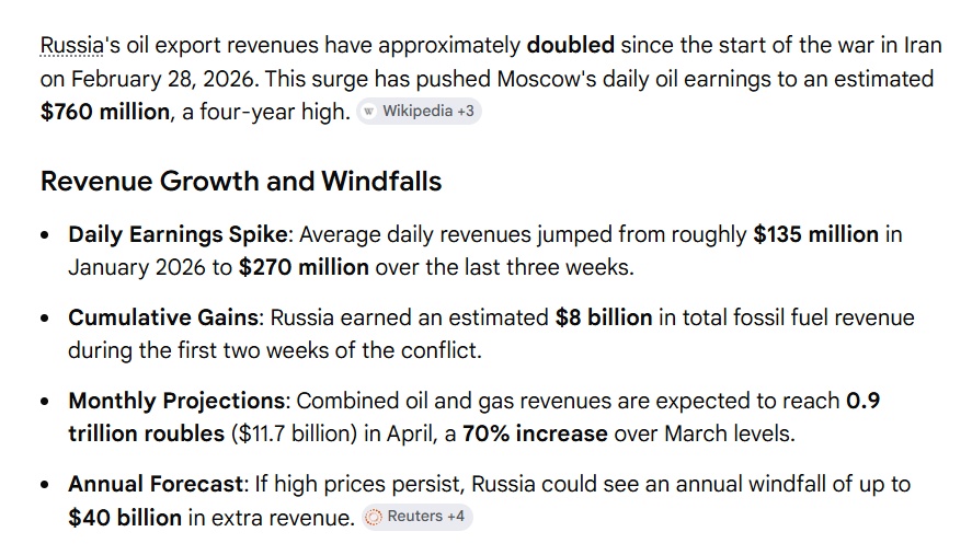 First, its tankers are transiting the Strait of Hormuz while most other Gulf oil supply is still trapped. Then, the massive supply shock from the Middle East has hiked international crude prices to above $100 per barrel (at about $105 a barrel of Brent early on Thursday), which adds more revenues from oil sales. And last but not least, the huge discount of more than $10 per barrel for Iran's oil to Brent before the war has now narrowed to just $2.10 per barrel this week.