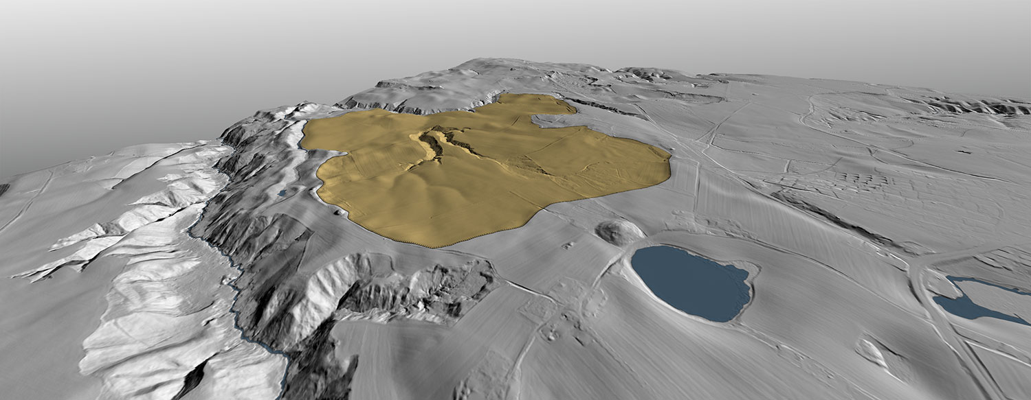 Here is a topographical picture from the article. Hard to determine the exact perspective absent any elevation lines. What I interpreted as a Fosse that recived the flow is probably an escarpment located at the headland. Is the slump flowing toward the pond or away and is it at the headland or the terminus? OK, I suppose that a jumble of snapped off timbers and sediments would argue terminius.