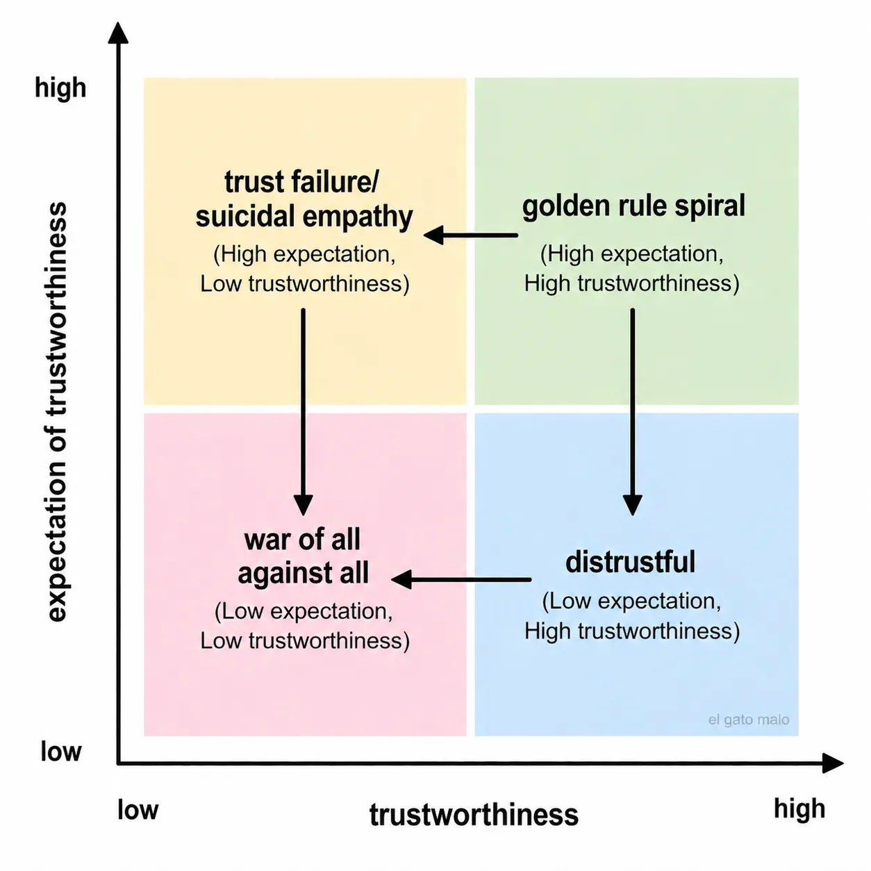 this creates an interesting matrix and implies that there are basically two ways to break a high trust golden rule/golden age spiral: