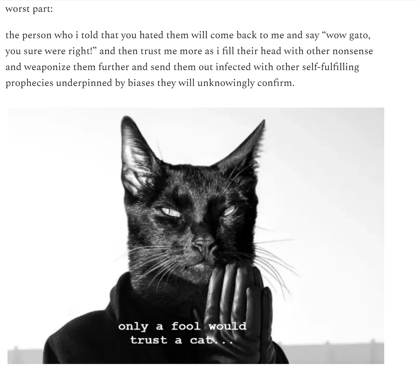 worse still, as discussed HERE once your perception bias has been confirmed, rather than realizing that whoever lied to you is a liar, you’ll see them as having given you a good and accurate warning. the whole thing is a self winding clock to entrap the credulous and embroil them in conflict and mistrust.