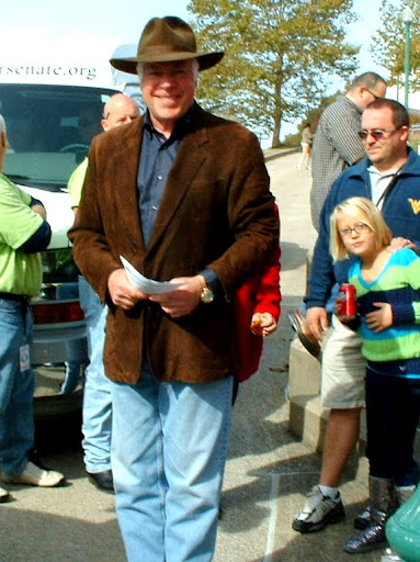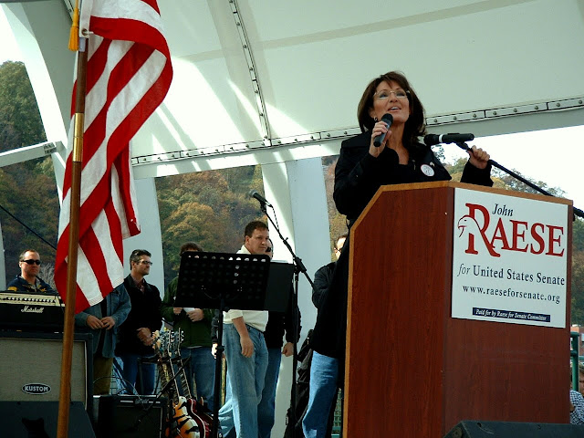 Shelley Moore Capito arrived first and she greeted and went on stage to speak briefly. John Raese arrived and I spoke with him and got some good pics. He went on stage with his wife. He gave a short speech and introduced his wife who then introduced Sarah Palin. I got a picture of Sarah and Todd standing at the back of the stage before she came out. Sarah rocked the crowd of course. W.Virginians can be a rowdy bunch. We gave her a fair greeting. I was so busy taking pictures for you guys, I wasn't really listening, but her speech was her standard stump speech. Called out the vets and talked about WV being almost heaven (of course it is. We know that). She and Todd had flown 18 hrs from AK to get here. I know she had to be tired.