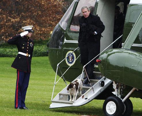 The two dogs were routinely brought out to greet the president upon his return to the White House from trips, no matter the hour, and often traveled with the Bushes to Texas or Camp David. Spot was always the more obedient, dutifully clambering onto a helicopter or Air Force One with no prompting while Bush often had to chase Barney down and hand him off to an aide to be carried aboard.