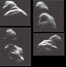 On Sept. 29, 2004 an asteroid the size of a small city will make the closest known pass of such a very large space rock anytime this century. Computer model based on radar data reveals different views of Toutatis. Note the shallow craters, linear ridges and a thin "neck" between two lobes. The neck my have been chipped away by impacts, or perhaps the lobes came together in a gentle collision.