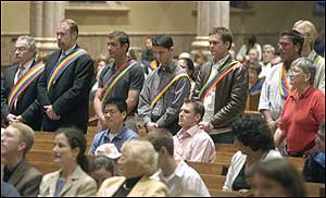 Members of The Rainbow Sash Alliance enter the Cathedral of St. Paul, Minn., Sunday, May 15, 2005. A group of about 100 gay Roman Catholics and their supporters were denied Holy Communion at Pentecost Mass at the cathedral. The Rainbow Sash Alliance has been taking Communion on Pentecost at the Cathedral for the past four years, but Archbishop Harry Flynn changed the policy this year. (AP Photo/Janet Hostetter)