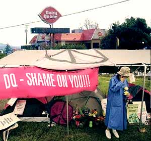 Local groups feel the same way. One spokesperson for STOP DQ! has confided, "We've hated Dairy Queen for a long time, but now they've gone too far with their Chili Lime Chicken Strip Baskets. This latest tragedy has given us a chance to draw our attention to Dairy Queen's despicable practices. The way we look at it, a self-righteous mother who trades on her son's misfortune has a lock on the moral high ground -- and is therefore immune to criticism. How can anyone not sympathize with the caring mom who fights the big bad CEO? And in the process, she gains celebrity and brings publicity to our cause to stop Dairy Queen. Sort of like Michael Moore getting his start by harassing Roger Smith in 'Roger and Me' only she's even more bitter. And she's a mom!"