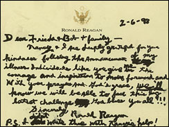 Originally it was believed Reagan wrote the note to a friend in February of 1998, about four years after he mostly disappeared from public view following his announcement that he had Alzheimer's Disease. In the letter he told a friend, "Individuals like you give me the courage and inspiration to move forward, and with your prayers and God's grace, we'll know we will be able to face this long latest challenge." He adds a P.S: "I didn't write this with Nancy's help."
