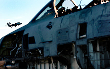 The ship erected a barricade across the flight deck to catch the errant jet. The new Hornets have all the gee-whiz stuff in them. As Randy Monroe of Ram Metals aimed his Bobcat tractor at the latest hulk resting in Oceanas bone yard, he said it represented merely another of the 70 or so Tomcats he has cut up.