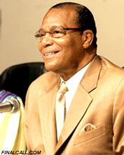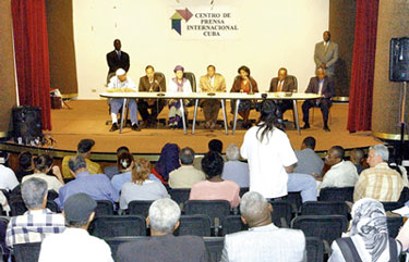 | (L-R): Dr. Conrad Worrill, Minister Rasul Muhammad, Mother Tynnetta Muhammad, the Honorable Minister Louis Farrakhan, an interpreter, Minister Akbar Muhammad and the head of the International Press Center in Havana, Cuba during a press conference on March 27. Photos: Kenneth Muhammad |
