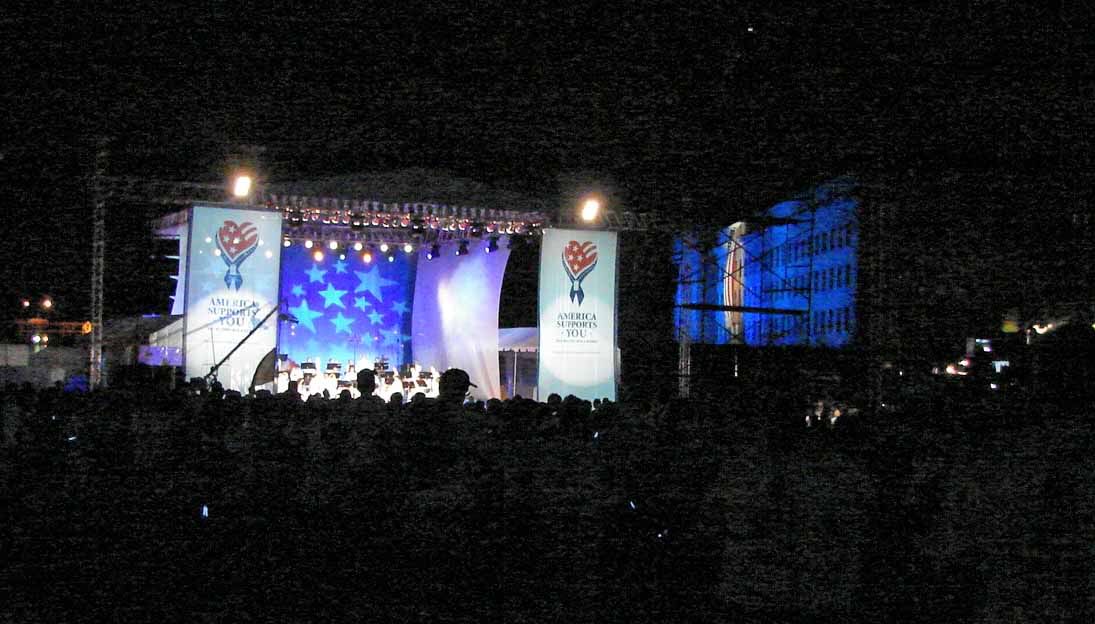 BELOW LEFT: Stage in Pentagon parking lot. BELOW RIGHT: Memorial beam of lights from on top of the Pentagon. There is one beam for each person killed at the Pentagon.
