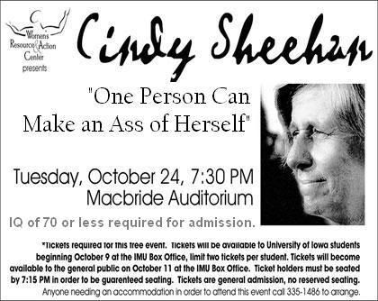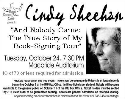 Cindy Sheehan "One Person Can Make a Difference" Tuesday, October 24, 2006 7:30 pm Macbride Auditorium University of Iowa, Iowa City IA