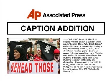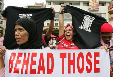 (Photo Caption) - Filipino Muslims display a banner, which reads 'Behead Those Who Insult Islam,' and t-shirts with a wanted sign during a rally Wednesday March 7, 2007, at a downtown Manila square , to protest recent televised preaching by a Christian sect leader Eli Soriano, who alleges that Muslims are killers. More than 1,000 Muslims took part in the rally and demanded Soriano, who is currently in hiding, be extradited back to the Philippines so he can face charges being brought against him. (AP Photo/Bullit Marquez)