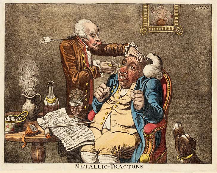 Gillray appealed, of course, to public opinion and was a pioneer in doing so: for he knew that his exposure of abuses and follies (and not merely political ones) would help, if not to end, then to limit them. Public criticism was thus essential to public progress, and Gillray knew its power. He had, for example, more or less single-handedly ruined the career of Benjamin Perkins, an American quack who had settled in London, by publishing a hilarious print of Perkins applying his metallic tractors to the rubicund nose of an obvious tippler. On the table next to the credulous patient (thoroughly electrified by the metal prongs that Perkins points at him) is a newspaper with an advertisement for the Perkinsian method: a certain Cure for all Disorders, Red Noses, Gouty Toes, Windy Bowels, Broken Legs, Hump Backs. There is no better preserver of common sense than ridicule, and no one who had once seen Gillrays print could continue to credit Perkinss false promises of a panacea. Like all the other caricaturists of the age, Gillray exhibited a great interest in medicine, and his print of the goutthe Georgian disease par excellenceas a little blue devil sinking its sharp fangs into the inflamed joint of the sufferers big toe is the sharpest pictorial representation of a disease ever drawn (page 105).