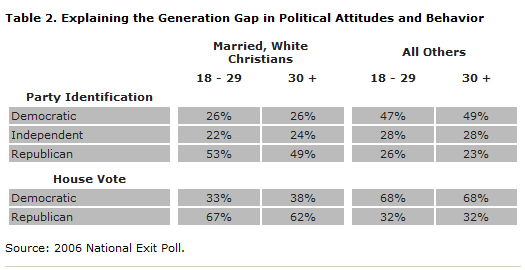 That's not to say the GOP couldn't fade away, just as the Dems came very, very close to utterly fracturing about four years ago---but it's highly unlikely. What I see in the posts above are whines and complaints that the GOP hasn't been conservative enough (true), but which don't address the MAIN point of the analysis, which is that those who tended to be conservative were married, older, and above all, religious. Now, I don't care if it's the "Conservative Party" or the Save the Whales Party, if you don't reverse that trend of married/religious people, you will simply get more liberals. And that's a fact.