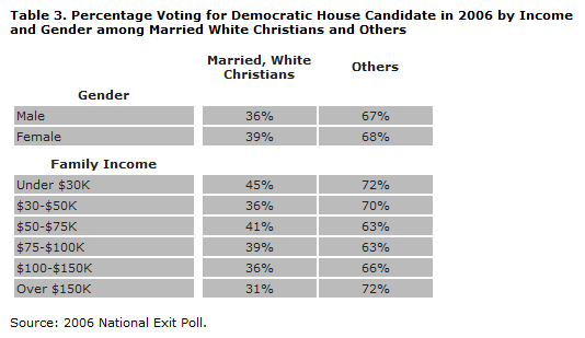 The "Married" category is just one of those mentioned where a complicated reality lies underneath. Now or in the future, being non-Christian or non-white may no longer be as strongly associated with voting Democrat. I'll bet you a Bobby Jindal button on that.