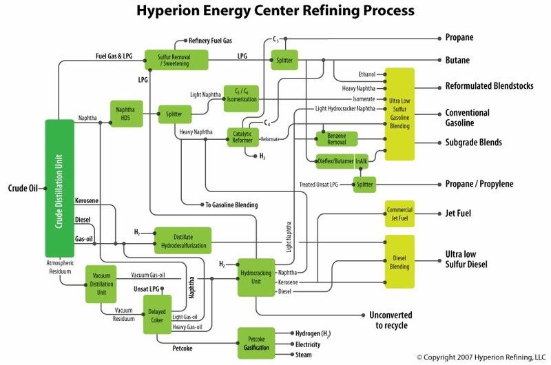 Hyperion touted the so-called "green" technology in its proposed energy center, which it claims would be the world's cleanest. The refinery would process 400,000 barrels of tar sands crude from Alberta into low-sulfur gasoline, diesel and jet fuel.