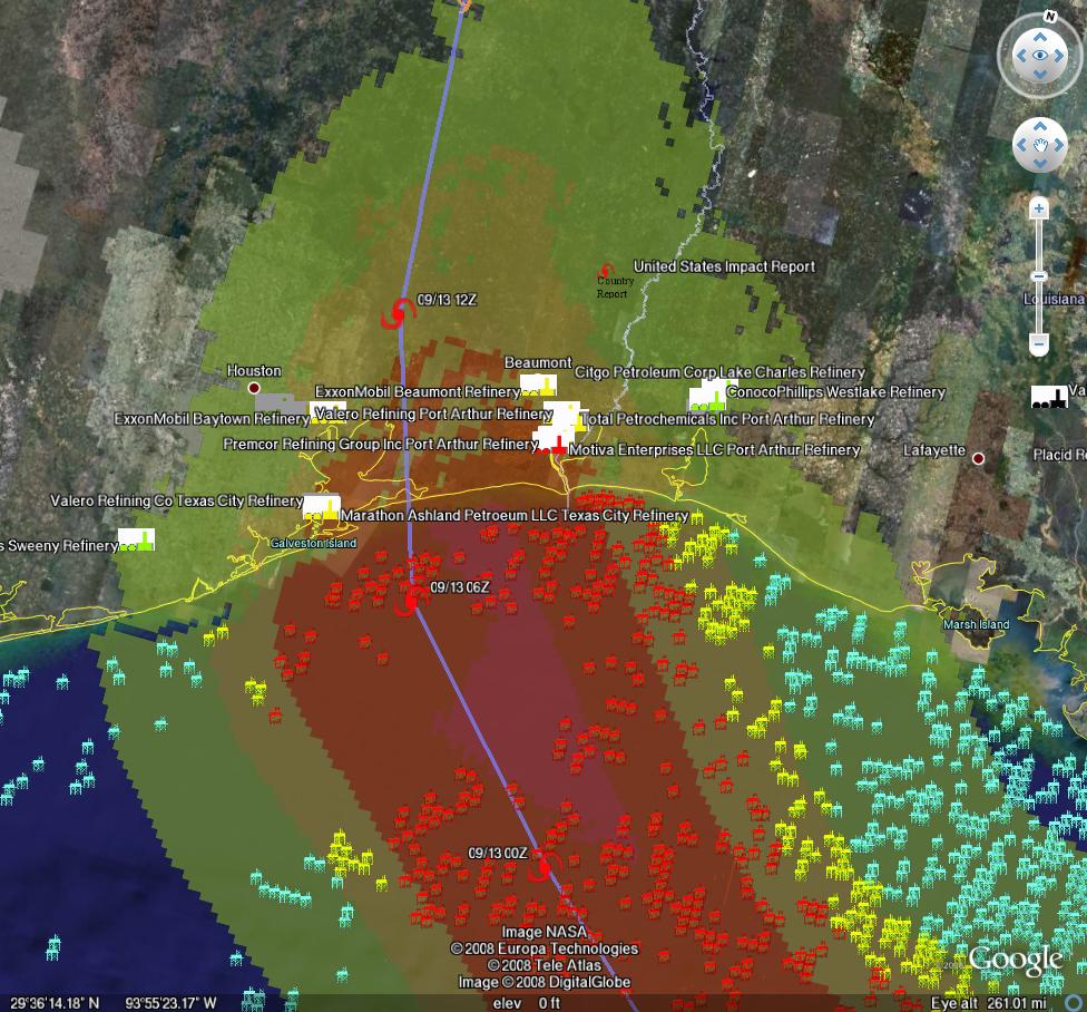 3) 20mi east: Not so bad for Texas City. Baytown Escapes, Pt Arthur? Oh, you mean Lake Arthur.At the moment, Ike is wobbling just to the right of the NHC track, which is sort of a "2a", and probably the best we can hope for at the moment. I'm thinking/hoping it will thread the needle and cause just coastal flooding due to wave setup and limited storm surge, but no extensive inland flooding. Look carefully at the surge map I sent; virtually all of the surge is to the right of centerline and in between the refineries. That's where we want it (to minimize damage).