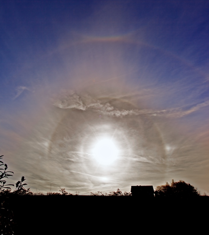 What could cause such an apparition? Atmospheric optics expert Les Cowley explains: "We can work outwards from the sun to explore the mysteries of this display. The first ring is an exceptionally bright and rare 9-degree halo made by tumbling pyramidal ice crystals in the clouds. The same crystals also produced displays on the other side of the North Sea the night before. The inner halo's bright upper and lower patches could be something very rare indeed, plate arcs from aligned pyramids. But we must be cautious, they could just be spots of thicker cloud!"
