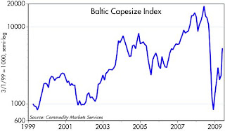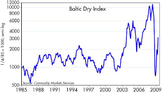 I've been referencing the upturn in the Baltic shipping indices since early February, arguing that they were a good sign that the global economy was coming back to life. As these charts demonstrate, the rebound in the cost of shipping raw materials has now skyrocketedthe Baltic Dry Index is now up 377% from its December low. If this isn't a V-shaped recovery in global trade, I don't know what else to call it. Skeptics will say this only represents Chinese stockpiling of commodities, and that may indeed be a significant factor. But something is definitely going on out there. Where there's smoke there's fire.