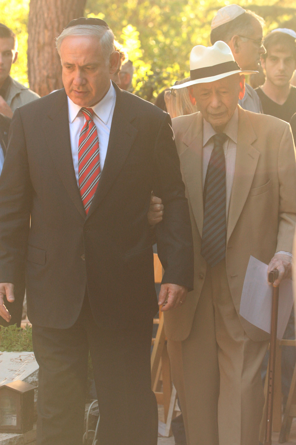 Israel's Prime Minister Benjamin Netanyahu walks with his father Benzion (2nd R), during a memorial ceremony for his brother, Yonatan, at Mount Herzl military cemetery in Jerusalem June 28, 2009. Yonatan Netanyahu was killed while leading the 1976 raid to rescue hijacked Israeli hostages from Entebbe, Uganda.