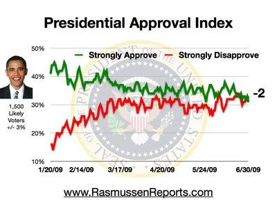 Today's Rasmussen reports presidential tracking poll shows that 31 percent of voters surveyed strongly approve of the job president Obama is doing. But 33 percent strongly disapprove. That means the president's approval index rating has fallen below zero for the third time in 10 days.