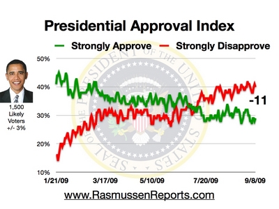 The Rasmussen Reports daily Presidential Tracking Poll for Tuesday shows that 29% of the nation's voters Strongly Approve of the way that Barack Obama is performing his role as President. Forty percent (40%) Strongly Disapprove giving Obama a Presidential Approval Index rating of -11 (see trends).