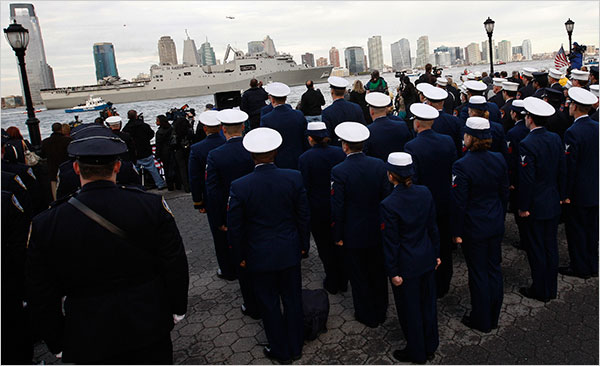 The soon to be commissioned USS New York sails up the Hudson River approaching midtown Manhattan a few minutes after pausing near the World Trade Center. A detail rendered a 21-gun salute in remembrance of the 2,976 murdered on September 11, 2001 as 9/11 family members, first responders, and a honor guard gathered just west of Ground Zero.