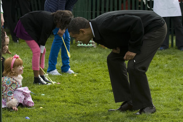 Fun was apparently detained at the White House gate. At the Easter egg hunt, kids searched through hay for hard-boiled eggs, rather than eggs filled with candy, i.e., the kind of eggs a child would actually want to hunt for. At the egg-dyeing station, kids used child-safe egg tongs rather than the usual octagonal wire. It might poke an eye out! I hoped at the very least to crack open my egg and have a taste. Not so fast. “Enjoy the beauty of your decorated eggs but please do not eat them,” said a sign. “They are not edible.”
