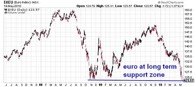 Meanwhile, the free-falling euro is trading at a long-term support zone. This looks an awful lot like blood in the street to me. While we may accept the premise that the bears have taken control of the market, these sentiment readings are setting the markets up for, at the very least, a bear market rally.