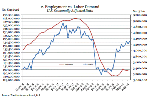 The growing gap here may be the unintended consequence of extending unemployment benefits seemingly indefinately. It becomes advantageous in many cases to remain unemployed rather than go back to work.