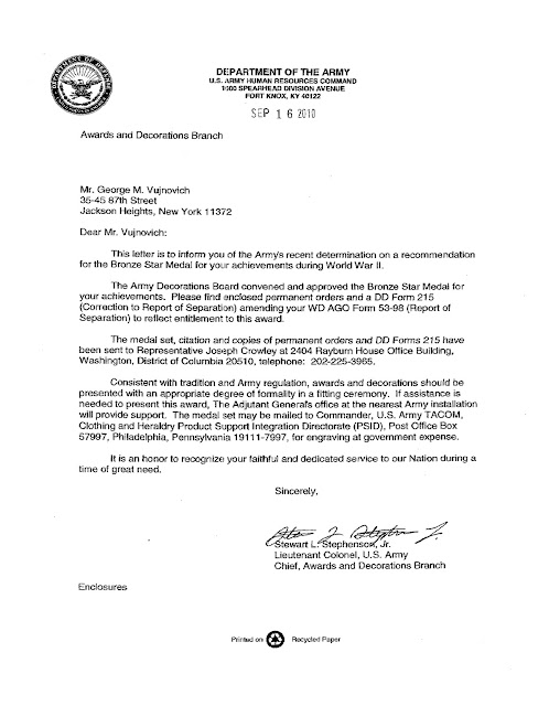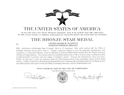 Please feel free to share this wonderful news. Please also note that the formal medal award ceremony for George Vujnovich will take place at the parish hall of Saint Sava's Serbian Orthodox Cathedral in New York City on Sunday, October 17th, at 3:45 PM. The medal will be presented to Maj. George Vujnovich by Rep. Joseph Crowley (NY).