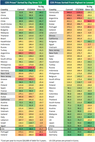 Below we highlight the 5-year credit default swap prices for the debt of 39 countries and four high-risk US states. We also highlight how default risk has changed since equity markets bottomed at the start of July.