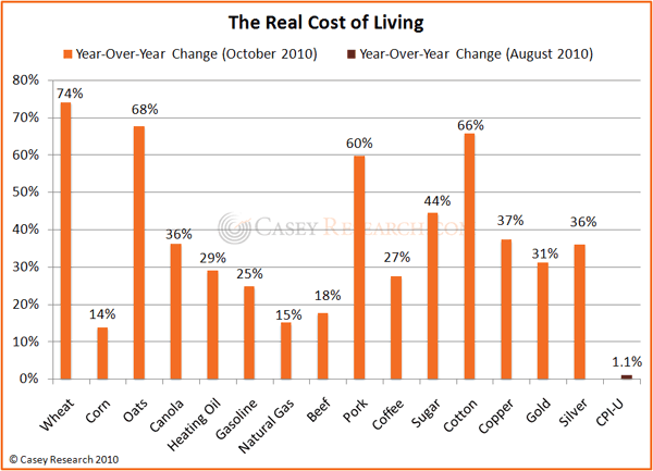I’ll have to run this article by my local supermarket. The same amount of eggs, meat, fruit and veggies now cost a good $40 over what I paid last year. (We don’t eat much canned or frozen stuff, but that’s gone up too.)