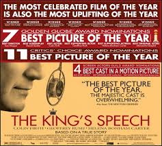 You will love The Kings Speech, a new movie about Great Britain in the '30s, a time of hesitation and then greatness, when the country reluctantly faced up to the challenge of Hitler and Nazism, two years before the United States similarly faced up.