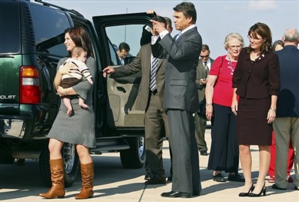 All in the Family: Texas Gov. Rick Perry directs Willow Palin(carrying infant Trig Palin)as Republican veep candidate Alaska Gov. Sarah Palin arrives at San Antonio International Airport. Oct. 3, 2008.
