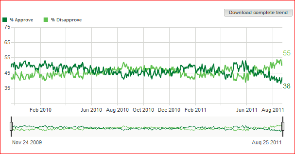 Since June, his disapproval rate has climbed 5 percentage points a month (from 45% then to 55% now). Thus, by November 2012, he’ll be well over 100%!