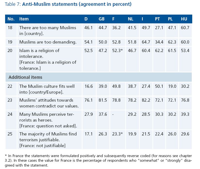 The Friedrich-Ebert-Foundation published a study on intolerance and prejudice in Europe. The study "Intolerance, Prejudice and Discrimination" is available in German and English. I bring below the section relating to Muslims.