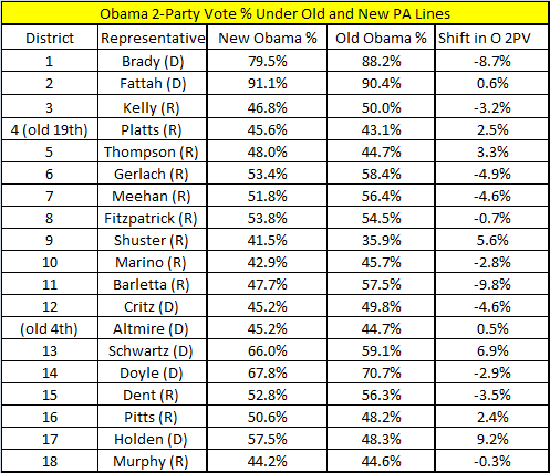 A few quick notes: The new 4th district is just a renumbered version of the old 19th district, while Democrats Mark Critz and Jason Altmire were placed together in the new 12th district. Also, the new district percentages were compiled using Daves Redistricting Application; it doesnt allow for precinct-splitting, so some of these numbers may be off by a 10th of a point or so.