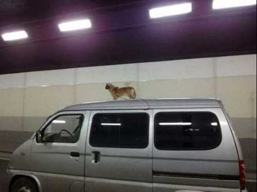 Dog, in a carrier, on a car roof. Bad. Dog running around in the back of a pickup, good? Just asking.