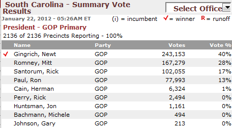 In spite of a carefully timed announcement by Newt Gingrich's ex-wife Marianne on an "Open Marriage, Mistress Proposal", Gingrich rallied from a 16 point deficit on January 3 to a stunning 12 percentage point slaughter of Mitt Romney less than three weeks later.