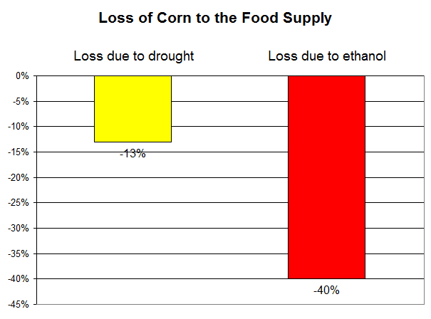 The Department of Agriculture says the corn crop in the US will be down 13% due to the drought. But corn available for food uses is down 40% due to the ethanol mandate. You do the math. Wait, I don't trust your math. I will do it for you: