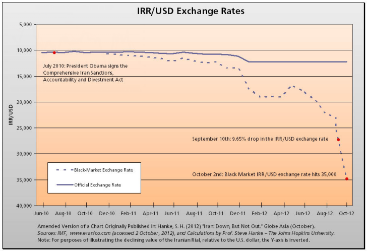 When President Obama signed the Comprehensive Iran Sanctions, Accountability, and Divestment Act, in July 2010, the official Iranian rial-U.S. dollar exchange rate was very close to the black-market rate. But, as the accompanying chart shows, the official and black-market rates have increasingly diverged since July 2010. This decline began to accelerate last month, when Iranians witnessed a dramatic 9.65% drop in the value of the rial, over the course of a single weekend (8-10 September 2012). The free-fall has continued since then. On 2 October 2012, the black-market exchange rate reached 35,000 IRR/USD a rate which reflects a 65% decline in the rial, relative to the U.S. dollar.Iranian Rial Black Market Exchange Rates