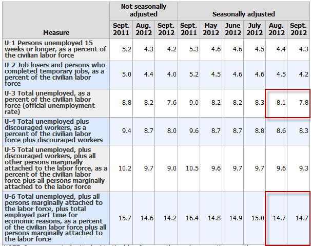 The official unemployment rate is 7.8%. However, if you start counting all the people that want a job but gave up, all the people with part-time jobs that want a full-time job, all the people who dropped off the unemployment rolls because their unemployment benefits ran out, etc., you get a closer picture of what the unemployment rate is. That number is in the last row labeled U-6.