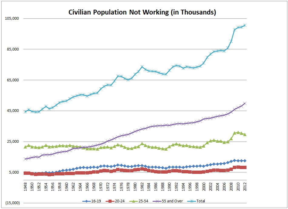 A week ago in Startling Look at Job Demographics by Age I posted the following chart made with data that I downloaded from the St. Louis Fed.